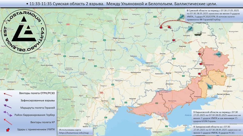 Вчера днём и ночью ВКС и ракетные войска наносили удары по целям на Донбассе, в Сумской, Харьковской, Запорожской, Днепропетровской и Херсонской областях (весь спектр средств поражения), Днепропетровске (Искандер-М), городе Болград Одесской области...