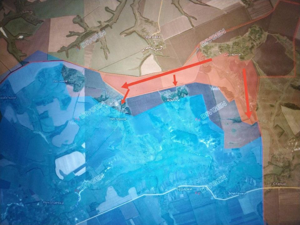 Восточнее 25 км, в районе Дегтярного, наши ВС РФ продвинулись по высотам и вышли к Нестерному и Крутому, а также южнее Дегтярного до 3 км в направлении с. Землянки.