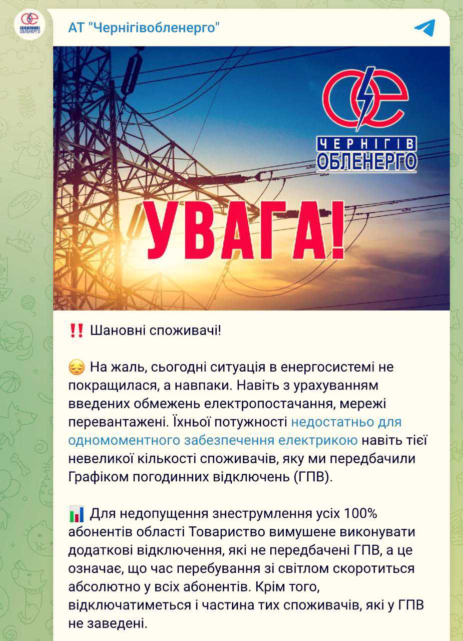 Ситуация в энергосистеме Чернигова продолжает ухудшаться. Подача электроэнергии даже по ранее утверждённому графику «3 часа через 6» стала невозможной — свет подают ещё реже