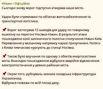 "Враг применил 12 шахедов для удара по товарному эшелону на перегоне Носовка-Нежин. В результате атаки повреждены пути железнодорожного полотна сообщения Нежин-Киев. Перевозки в указанном направлении пока приостановлены. Поезда из Киева временно курсируют до станции Носовка. Также было попадание по одному из объектов энергосистемы города. В результате повреждения произошло аварийное отключение электроснабжения в некоторых районах города. Кроме того, разрушениям подверглась складская инфраструктура Укрзализныци. Произошел пожар по всей площади крыши."