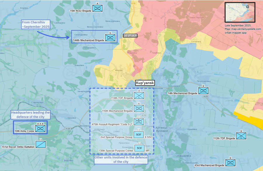 144-я механизированная бригада ВСУ с весны находилась в Черниговской области, на северной границе. К концу сентября их перебросили в район Кондрашевки, на один из флангов наступающей группировки войск ВС РФ, стремящихся освободить Купянск.