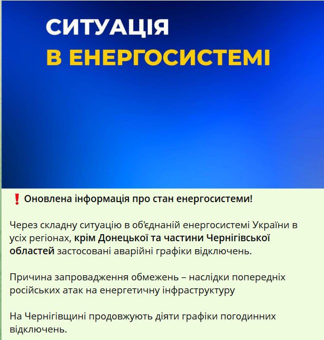 Компания «Укрэнерго» сообщила, что «из-за сложной ситуации в энергосистеме во всех регионах Украины применены аварийные отключения электроэнергии».В Черниговской области действуют почасовые графики подачи электричества:«При почасовом режиме свет...