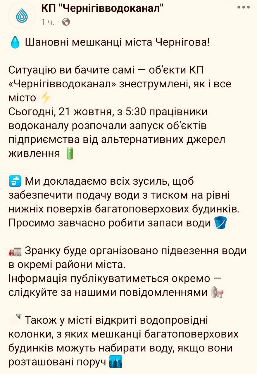 Город Чернигов полностью обесточен после прилетов по энергетической инфраструктуре, сообщил местный водоканал