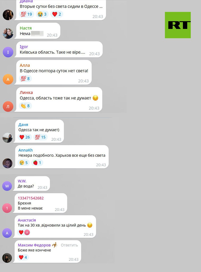 «Света как не было, так и нет», «Вторые сутки сидим без света в Одессе», «Харьков всё ещё без света».