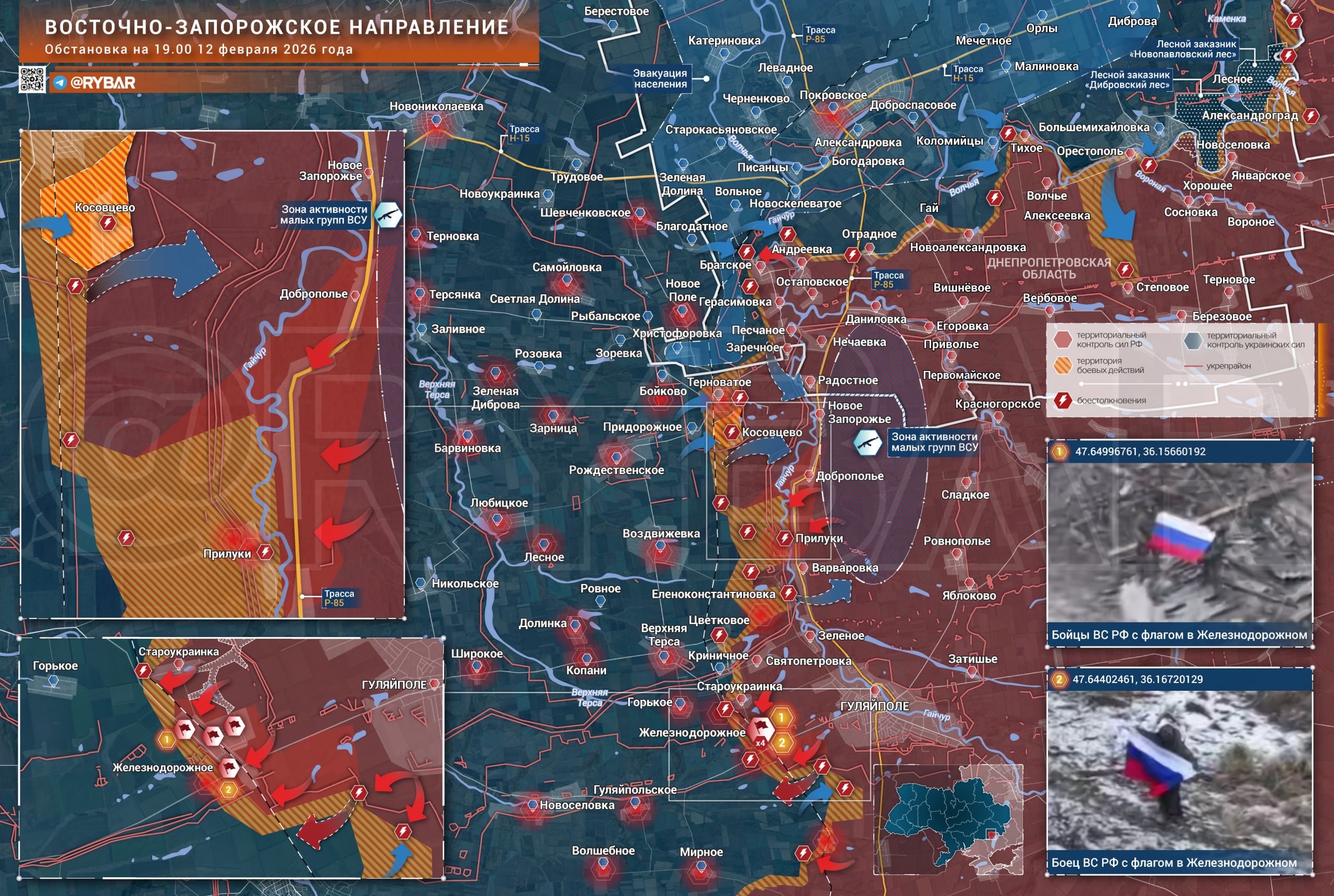 На западном фланге идут встречные бои на берегах Гайчура Противник смог войти на территорию Терноватого, Косовцево и Прилук, а также прорвался к окраинам Еленоконстантиновки. Полностью вытеснить российские подразделения из этих населённых пунктов враг не сумел. Бои носят тяжёлый и затяжной характер. В Доброполье же прорвавшаяся техника ВСУ была уничтожена вместе с десантом, часть пыталась рассеяться по подвалам.