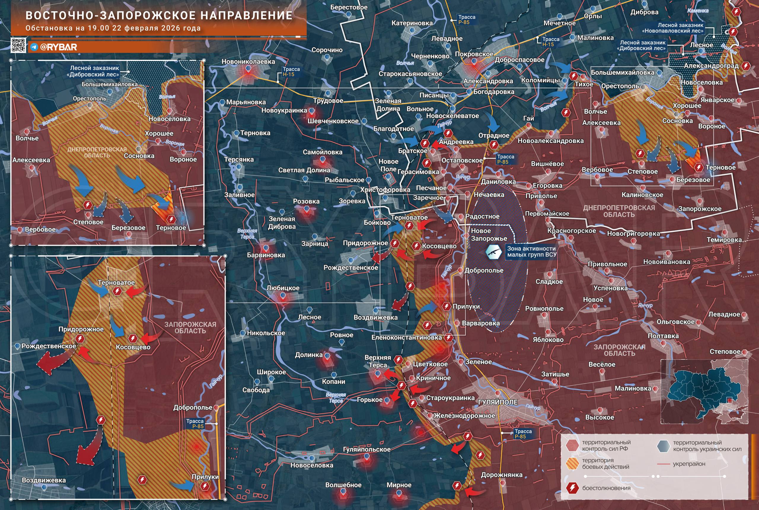 Из-за «временного лага» в публикации видео и нестабильных погодных условий пока что невозможно установить актуальную конфигурацию фронта на участке. Подобный «туман войны» сохраняется на всей территории от Тернового до Орестополя, где позиции обеих сторон оказались перемешаны между собой.