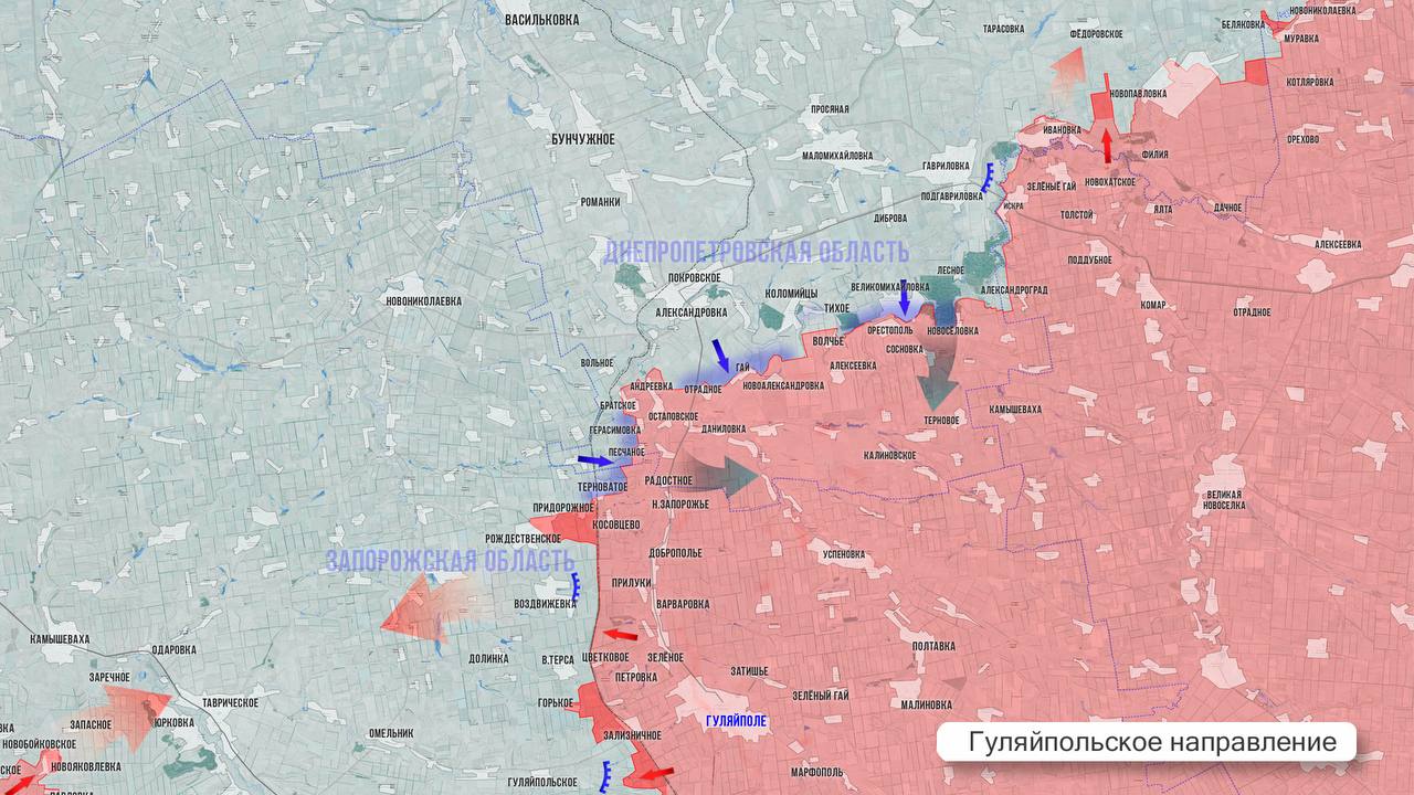 На Гуляйпольском направлении ВС РФ продвигаются со стороны Горького к крупному опорнику южнее Верхней Терсы, а также со стороны Цветкового. Его освобождение позволит стабилизировать фронт, именно отсюда противник забрасывал ДРГ в район Прилук и Еленоконстантиновки. В районе Рождественского наши бойцы укрепляют позиции на восточных окраинах. На северном фланге ситуация остаётся тревожной – со стороны Покровского ВСУ пытаются вклиниться в сторону рубежа Вишнёвое – Вербовое.